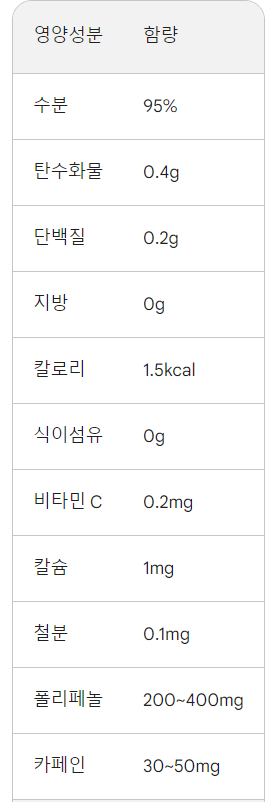 홍차는 수분 함량이 95%로 매우 높습니다. 탄수화물, 단백질, 지방, 칼로리, 식이섬유의 함량은 매우 낮습니다. 비타민 C, 칼슘, 철분 등의 미네랄 함량도 낮은 편입니다.